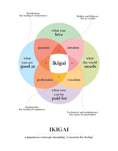 Ikigai is a Japanese term that translates to “a reason for being.” It’s the sweet spot where our passions, talents, and values align with what the world needs and is willing to pay for. This simple yet profound concept provides a framework for discovering our purpose and living a life of meaning. The Ikigai model presents four intersecting circles: What you love, What you are good at, What the world needs, and What you can be paid for. At the intersection of these four elements lies our Ikigai – the place where our passions, talents, and values converge with the needs of the world.